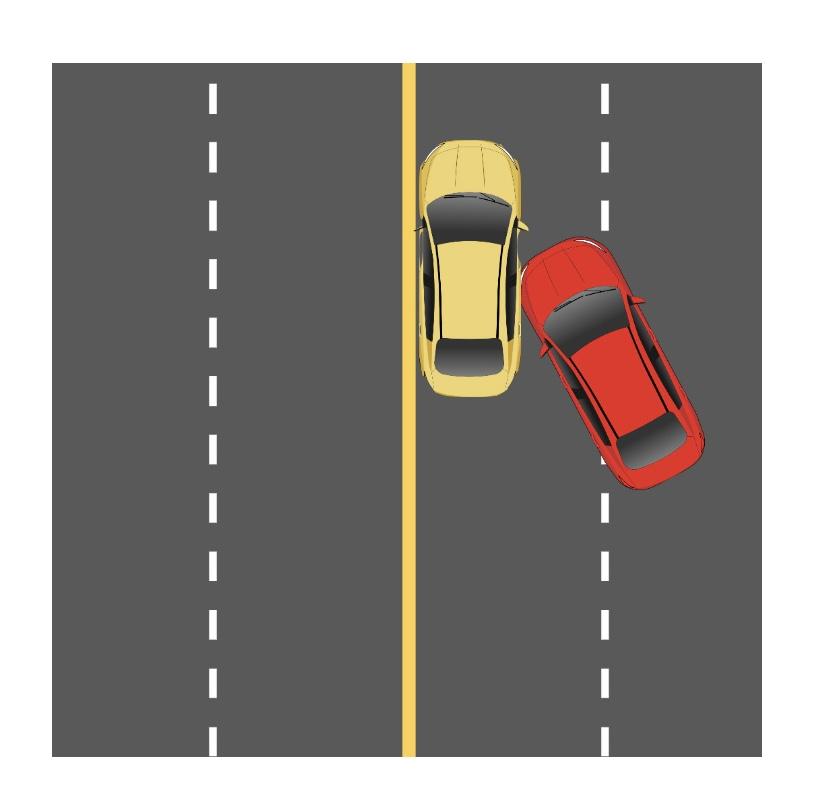 이후 노란색차량은 직진차량으로 차선왼쪽에 붙어서 주행하는 상황이었습니다. 빨간색차량은 정지한채로 노란색차량은 주행 중에 접촉사고가 발생하게 되었습니다.