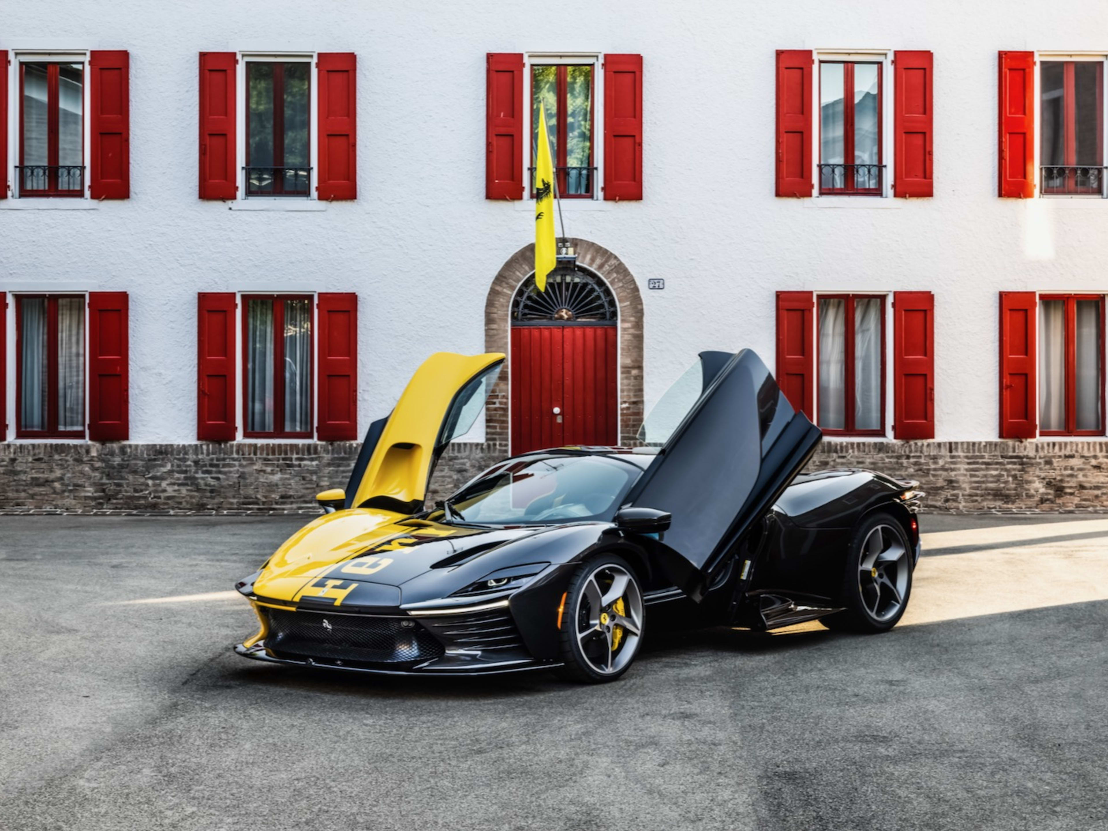 독특한 외관: 이 차량은 페라리의 맞춤 제작 부서인 '테일러 메이드'의 손길을 거쳐 탄생했습니다. 노란색(Giallo Modena)과 유광 탄소섬유가 결합된 비대칭 투톤 컬러가 적용되었으며, 공장에서 제작된 페라리 로드카 최초로 차체 중앙을 가로지르는 페라리 로고 그래픽이 새겨졌습니다.