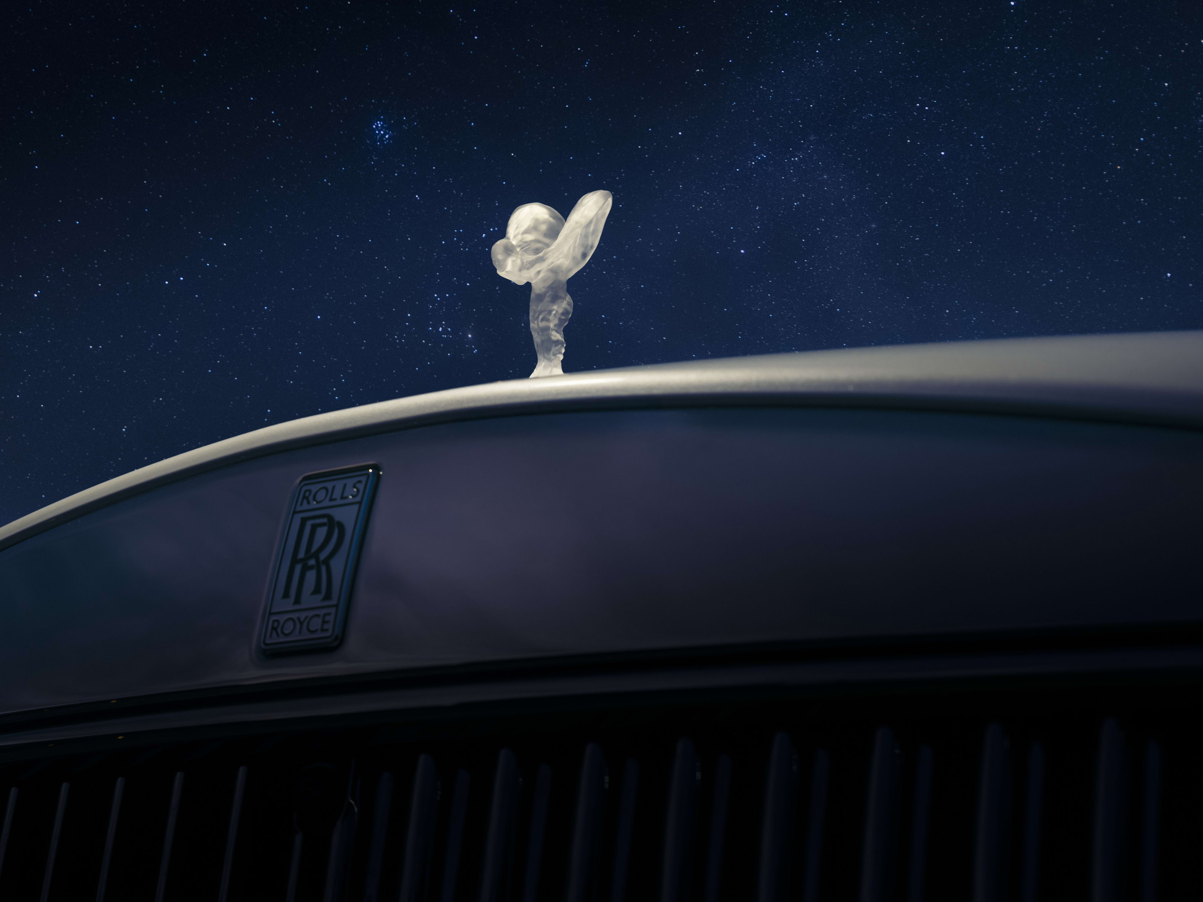 특히, 우주선과 같은 형상의 **환희의 여신상(Illuminated Spirit of Ecstasy)**이 발광하며 차량의 우주 테마를 강조합니다. 롤스로이스 비스포크 역사상 가장 정교한 디테일이 적용된 모델 중 하나입니다.