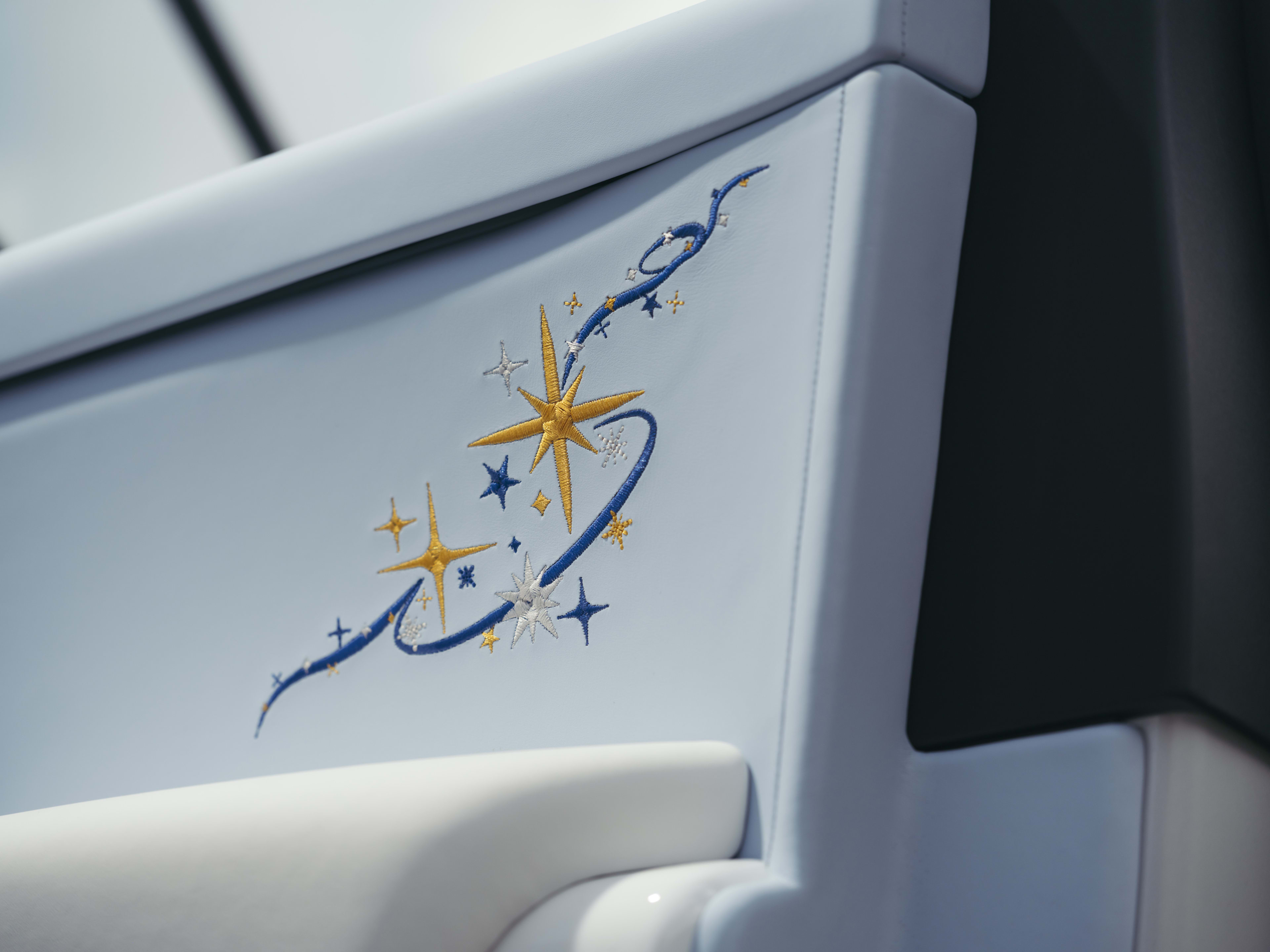 가장 압권은 스타라이트 헤드라이너입니다. 160시간에 걸쳐 수작업으로 그려진 헤드라이너는 20개 이상의 페인트 층을 쌓아 성운과 같은 효과를 냈습니다. 수천 개의 광섬유 조명이 그림과 정확하게 맞춰져 머리 위로 살아 있는 별자리를 구현합니다.